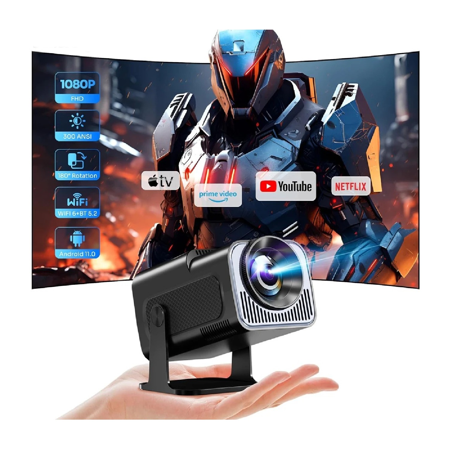 Vidéoprojecteur LED 1080p Natif 390 ANSI Lumens Android 11 pour Cinéma Maison