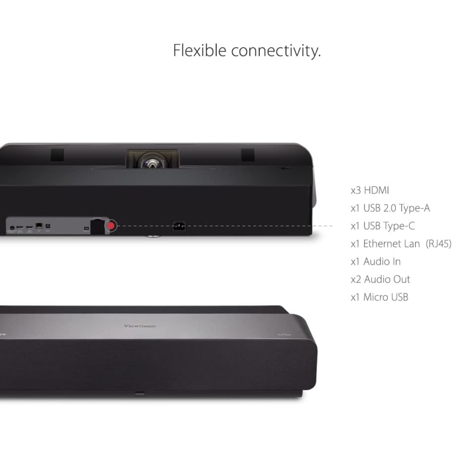 Notre projecteur dispose de trois ports HDMI 2.0 compatibles avec les flux 4K, d’un port USB 3.0, d’un port USB-C et d’une connexion Ethernet filaire pour une diffusion réseau stable. L’ensemble de ces interfaces permet de connecter simultanément plusieurs sources : lecteur Blu-ray 4K, console de jeu, PC ou périphérique de streaming. Le hub USB intégré facilite la gestion des appareils externes sans adaptateur supplémentaire. Cette polyvalence de connexion répond aux usages domestiques les plus variés.