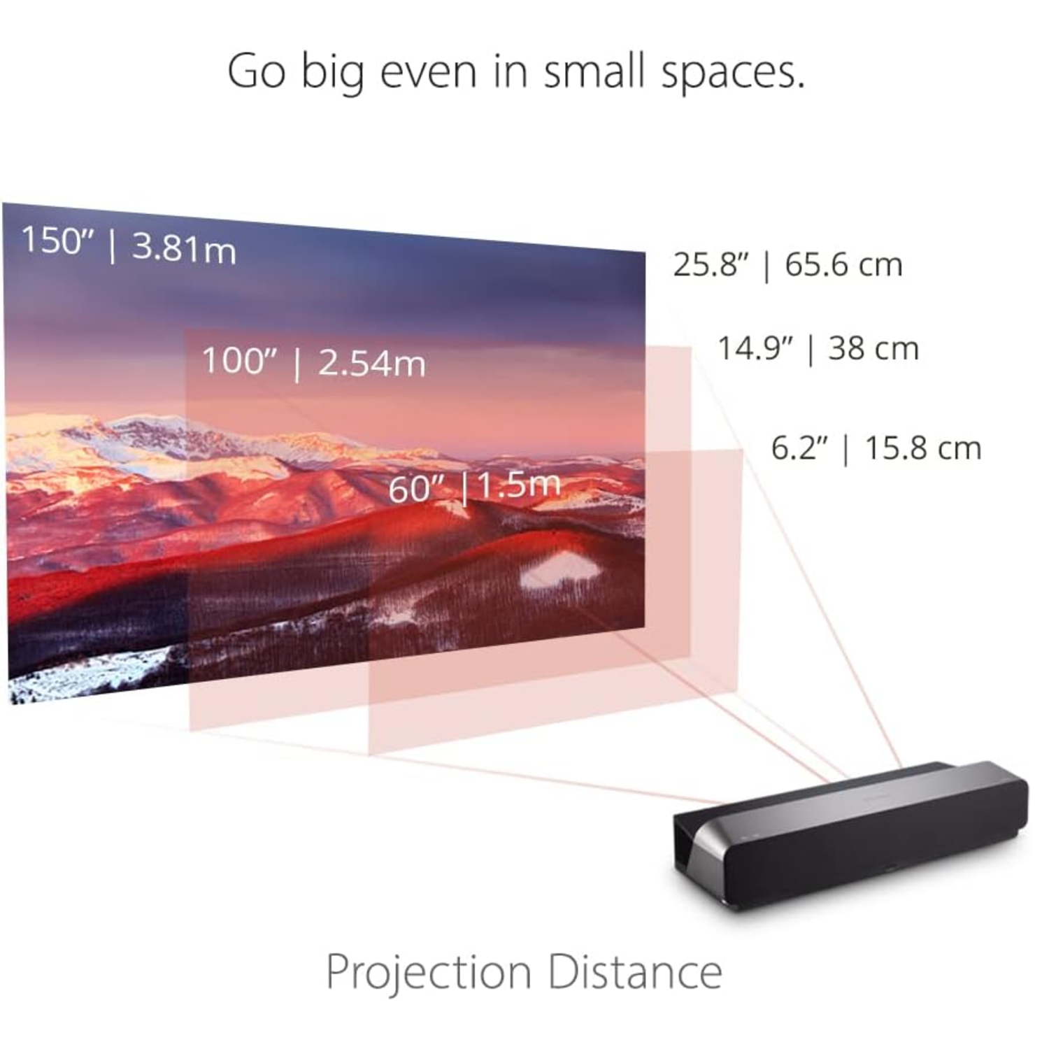 La source lumineuse LED sans lampe assure une stabilité chromatique dans la durée, sans les contraintes de remplacement propres aux projecteurs à lampe traditionnelle. L’objectif à ultra courte focale avec un ratio de 0,25 permet d’obtenir une image de 100 pouces avec seulement 38 cm de recul par rapport à la surface de projection. Ce positionnement au plus près du mur réduit les ombres portées et s’intègre discrètement dans tout aménagement intérieur. La technologie d’interpolation de trames est également intégrée, pour une fluidité accrue lors de la lecture de contenus cinématographiques.