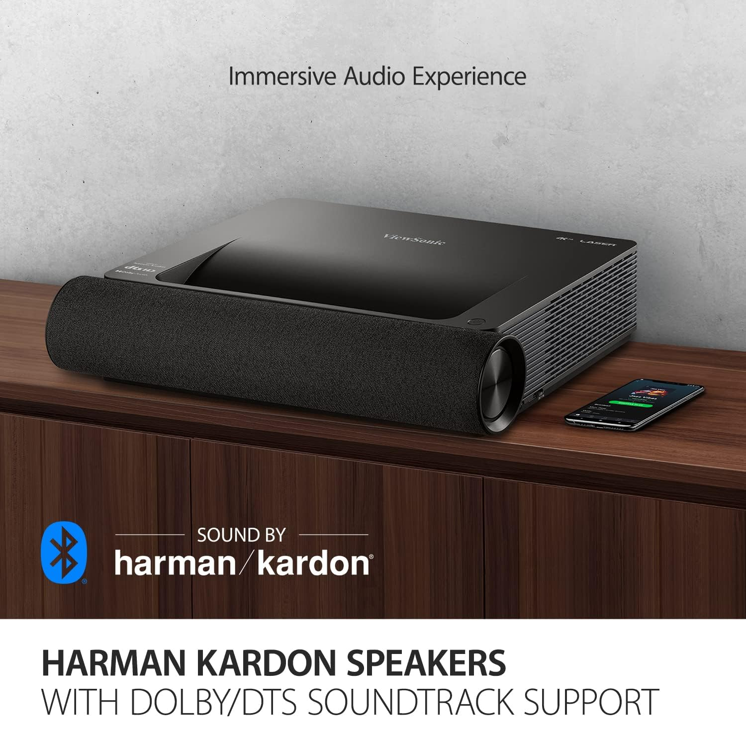 Notre solution audio embarque deux haut-parleurs Harman Kardon 2 x 25W avec compatibilité Dolby et DTS. Le rendu sonore couvre les basses, médiums et aigus avec une restitution équilibrée. L’intégration directe évite l’ajout obligatoire d’un système audio externe. Le volume sonore est adapté aux grandes pièces de projection. Cette configuration améliore l’immersion audiovisuelle globale.