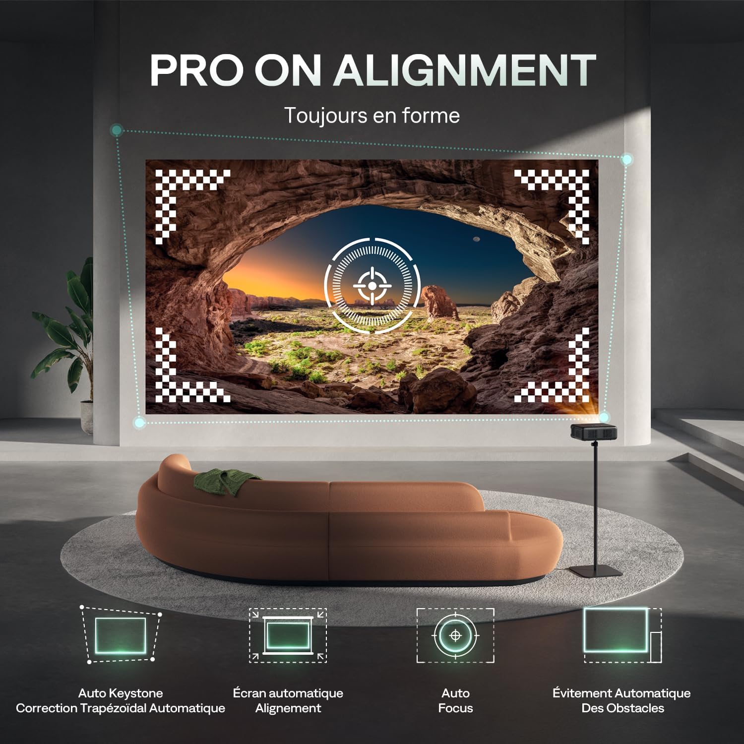 Le système d’assistance 4-en-1 inclut une fonction d’autofocus rapide pour une netteté instantanée. La correction trapézoïdale automatique et l’alignement de l’écran simplifient l’installation sur une table ou un support. Un capteur intelligent permet l’évitement d’obstacles afin de cadrer l’image parfaitement sans intervention manuelle de votre part.