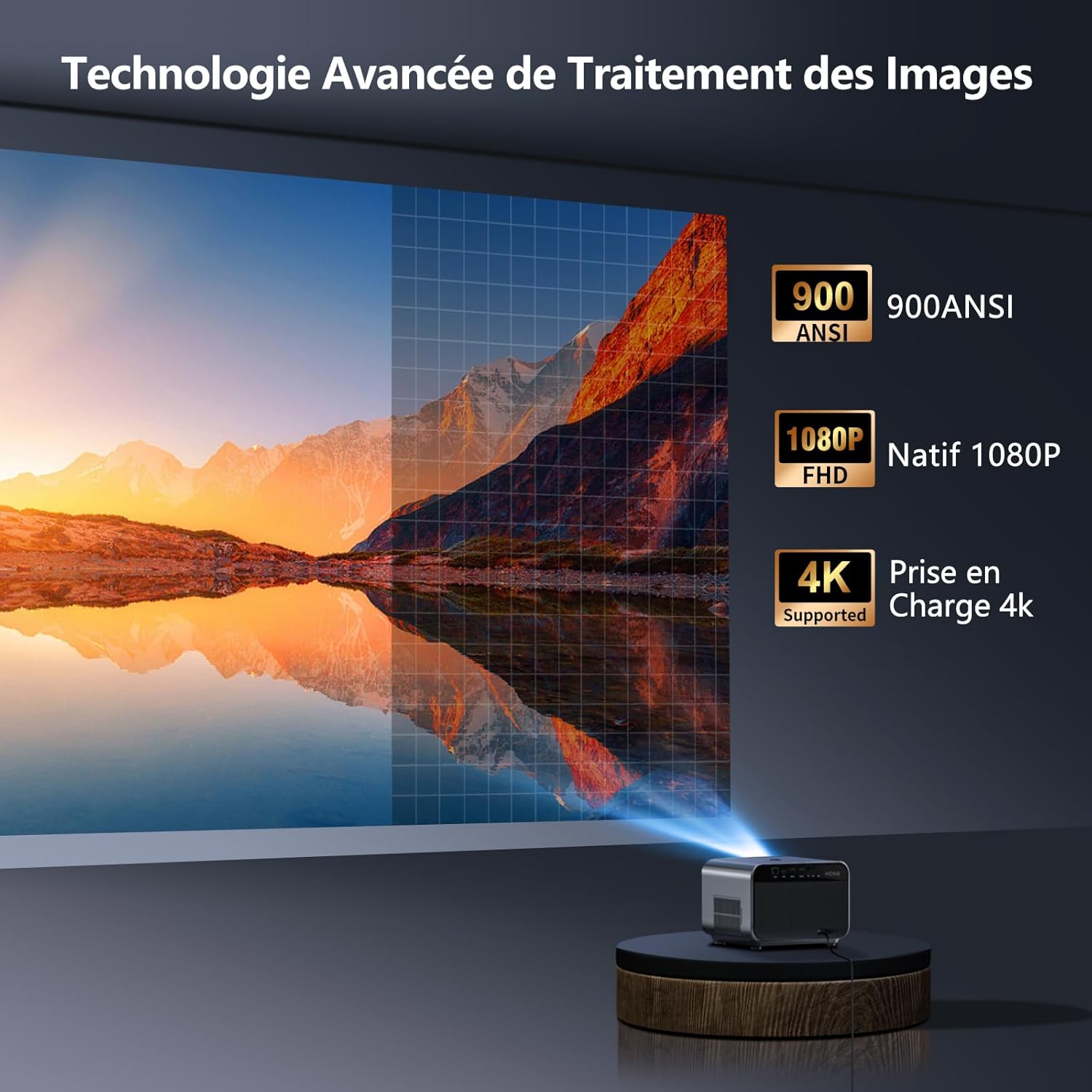 Notre projecteur délivre une image en résolution native Full HD 1080p (1920 x 1080 pixels) sans aucune mise à l’échelle logicielle. Le bloc optique génère une luminosité de 900 ANSI Lumens, ce qui permet de maintenir une lisibilité constante même dans des environnements avec une faible lumière ambiante. La source lumineuse LED assure une longévité importante tout en réduisant la consommation électrique globale.