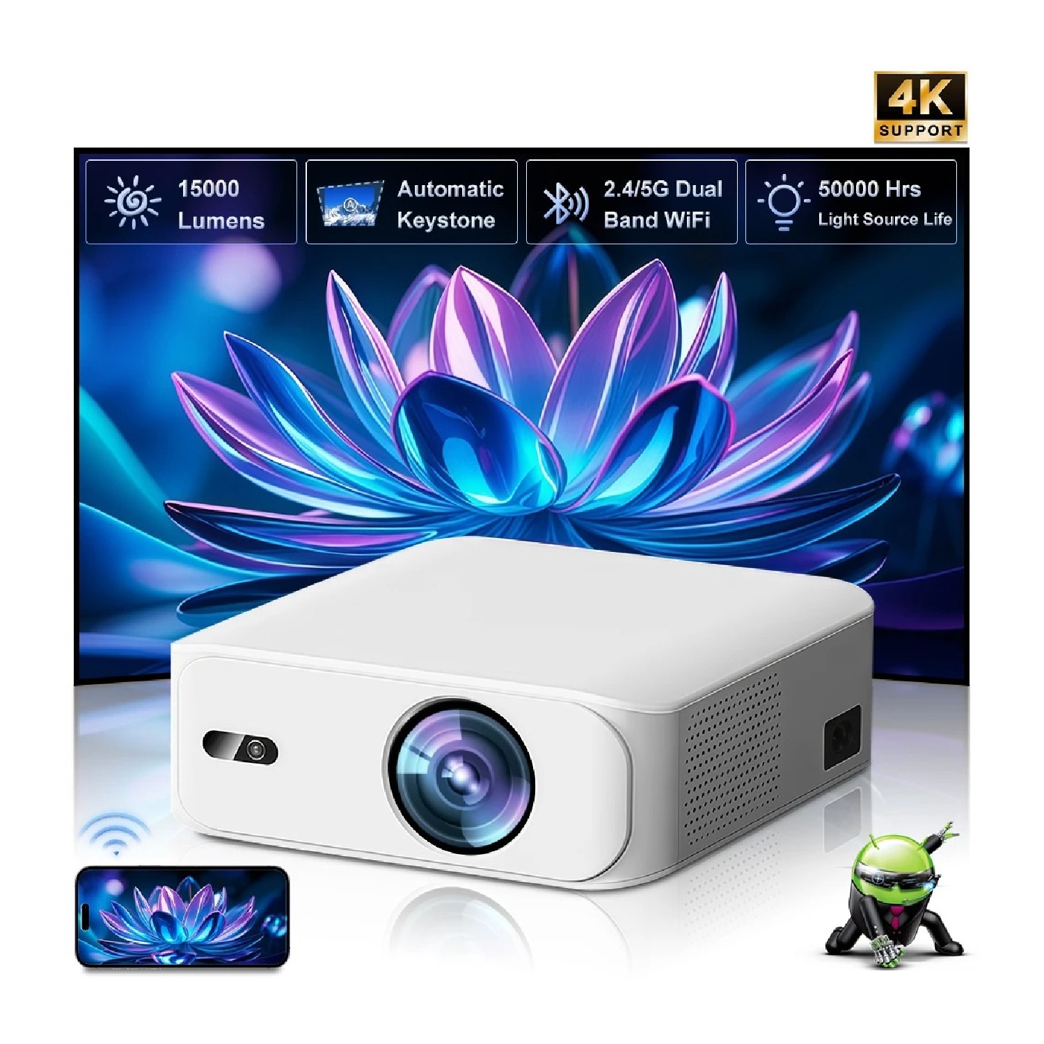 Projecteur LCD Full HD 1080P 800 ANSI Lumens avec Décodage 4K et Android Smart TV pour Home Cinéma Portable