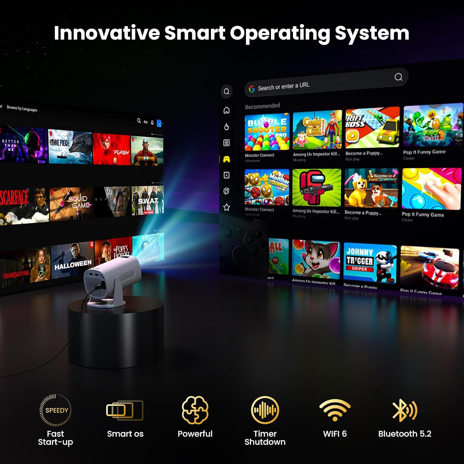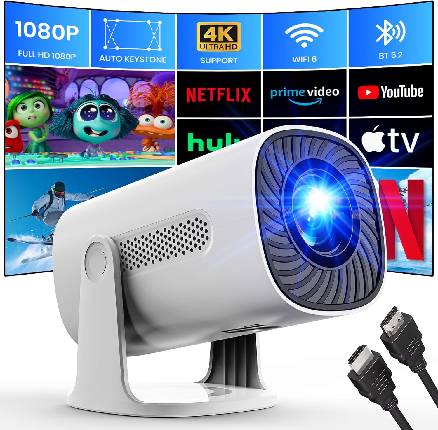 Vidéoprojecteur LED 1080P Natif Support 4K avec WiFi6, Bluetooth 5.2 et Correction Trapézoïdale