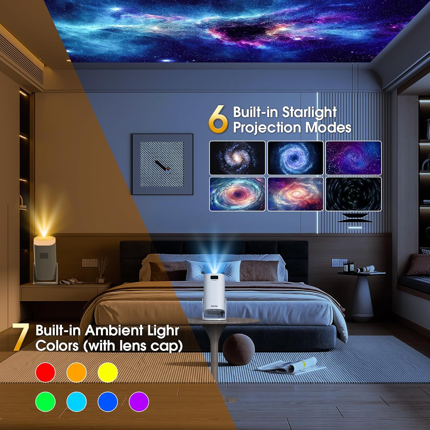 Notre interface propose 6 modes de projection galactique simulant les effets de la Voie lactée pour créer une atmosphère immersive. En complément, 7 couleurs de lumière ambiante sont paramétrables pour ajuster l’esthétique de la pièce selon l’usage. Ces fonctions transforment l’espace de visionnage en un environnement de relaxation ou de divertissement visuel complet.