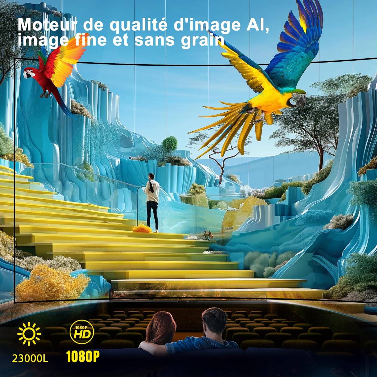L’affichage repose sur une résolution Full HD 1080p native de 1920 x 1080 pixels sans compression logicielle. Le rapport de contraste de 20000:1 assure une profondeur des noirs optimale pour le home cinéma et le jeu. Notre technologie LED couvre 98% de la gamme de couleurs NTSC pour une restitution chromatique fidèle. La durée de vie de la lampe atteint 60 000 heures de fonctionnement continu.