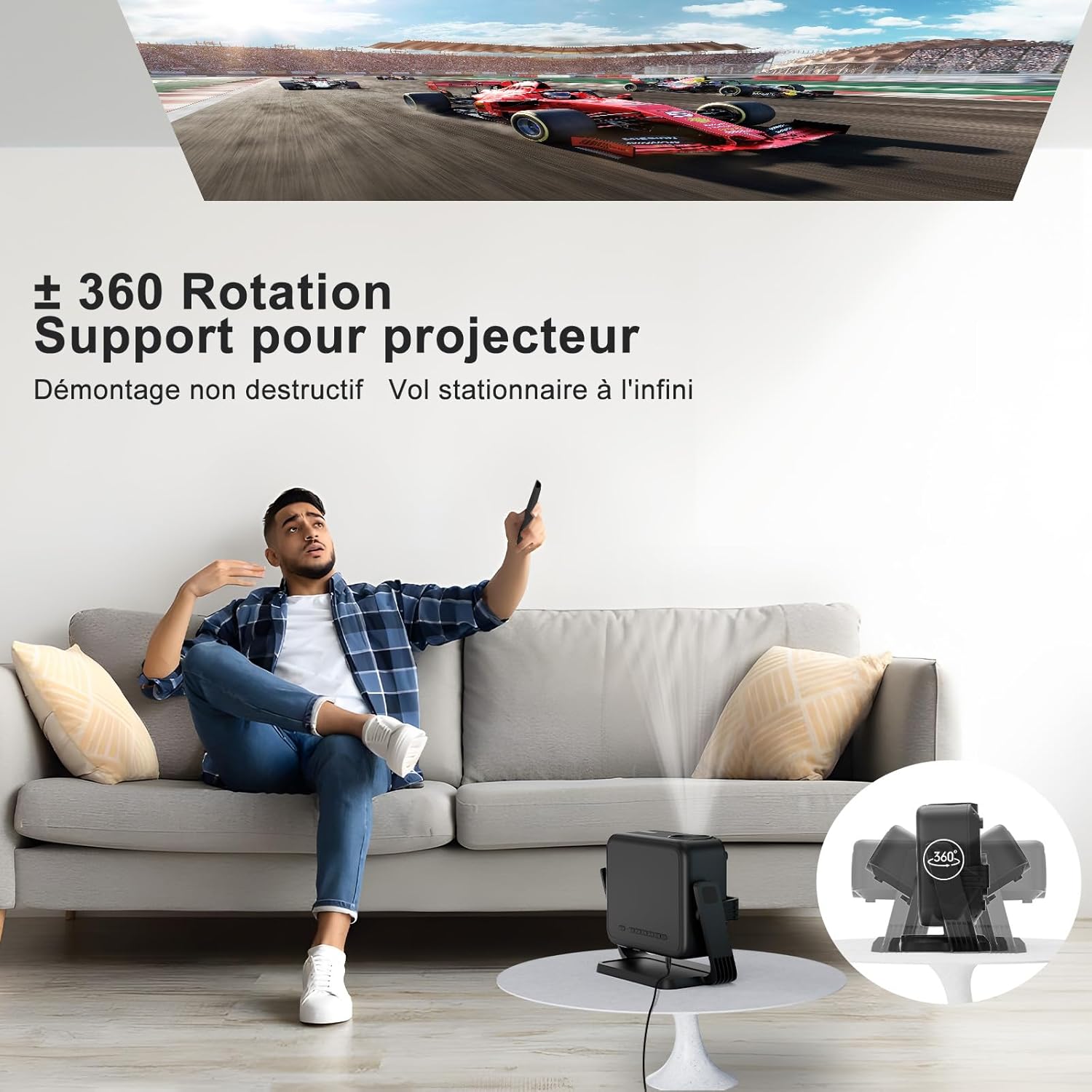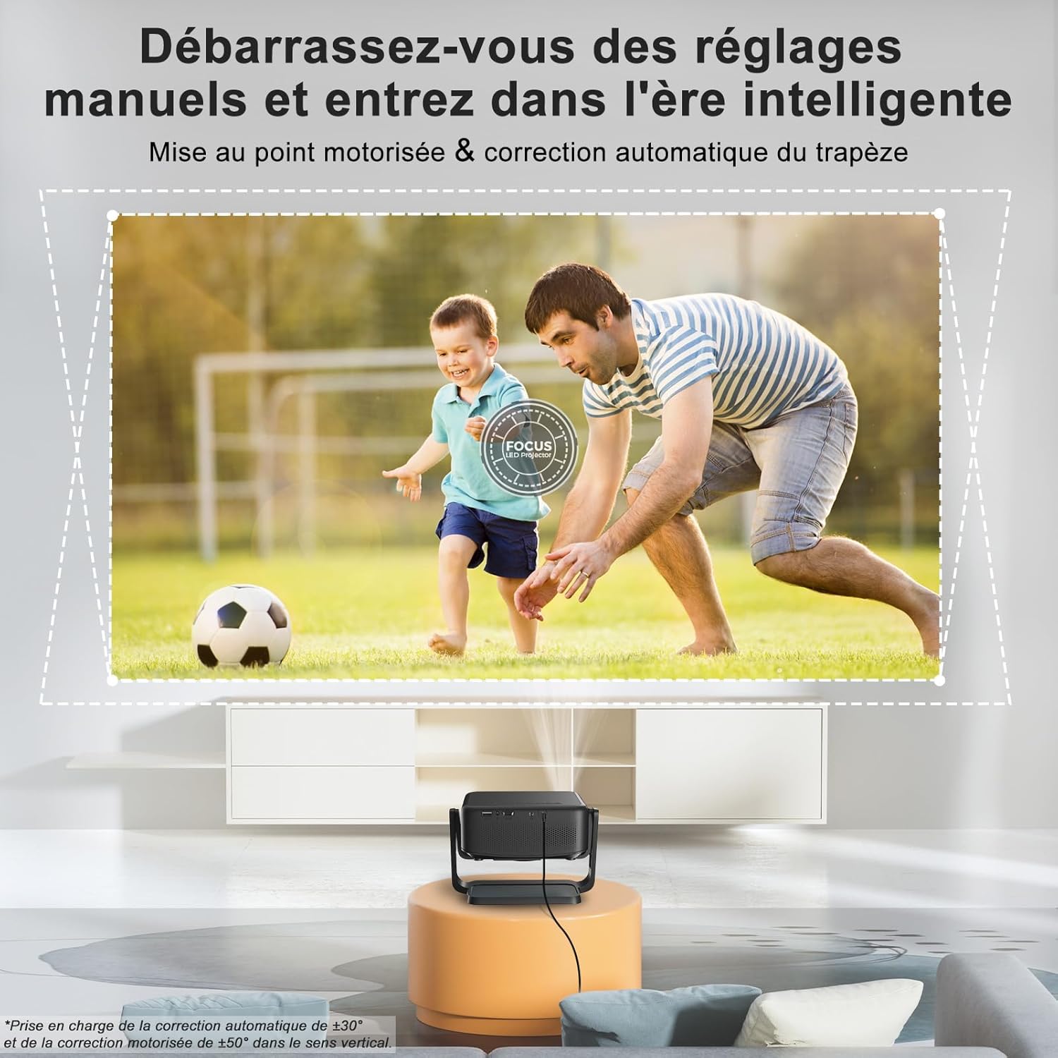 Le châssis est monté sur un support amovible rotatif à 360° permettant une projection directe au plafond ou sur les murs latéraux. Notre fonction de correction trapézoïdale verticale automatique rectifie instantanément la géométrie de l’image. Ce système compense les inclinaisons pour obtenir un rectangle parfait sans intervention manuelle complexe. L’installation ne nécessite aucun perçage grâce au socle stable et orientable fourni.