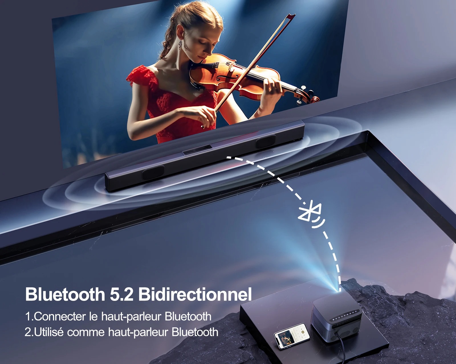 La technologie WiFi-6 intégrée supporte des débits sans fil élevés pour la mise en miroir des écrans iOS, Android et iPad. Le module Bluetooth 5.2 bidirectionnel permet de connecter des enceintes externes, des casques ou des AirPods pour une diffusion audio sans fil. L’appareil peut également fonctionner comme une enceinte Bluetooth autonome en recevant le signal audio directement depuis votre smartphone.
