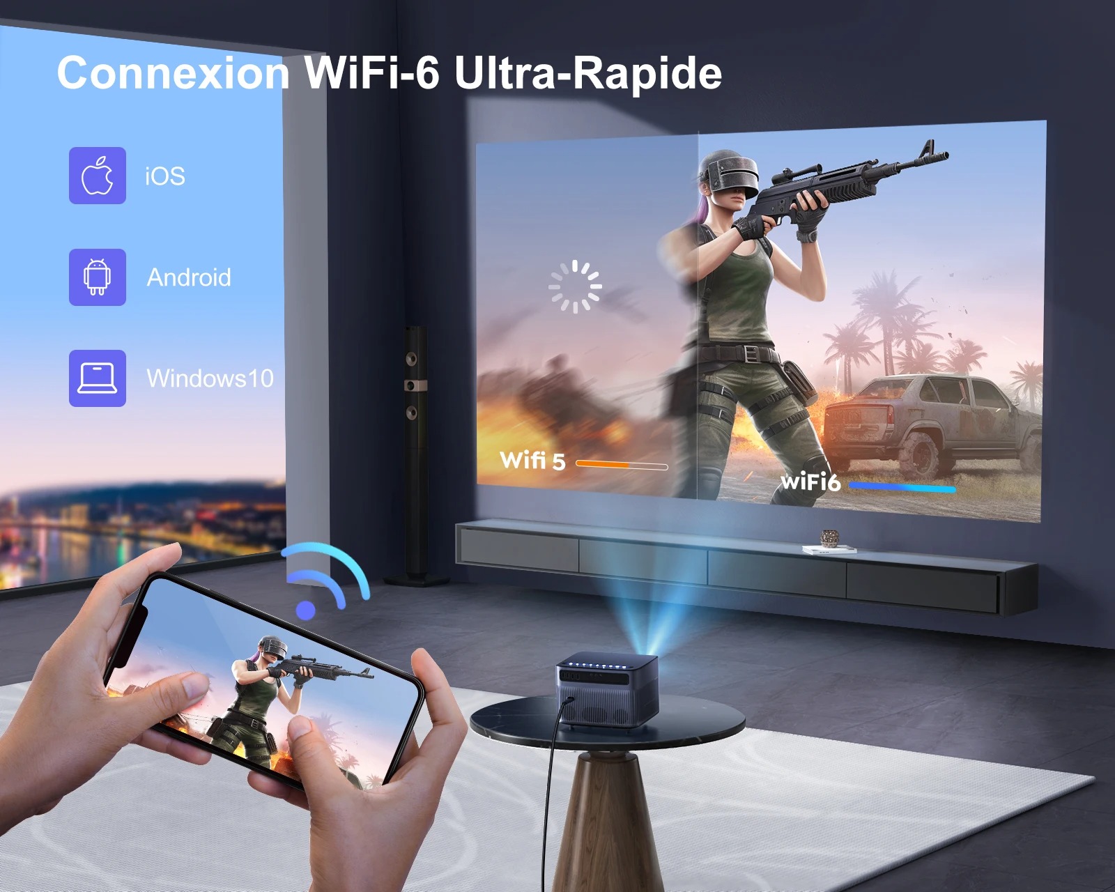 Vidéoprojecteur Full HD 1080P natif support 4K avec 25000 Lumens et WiFi-6