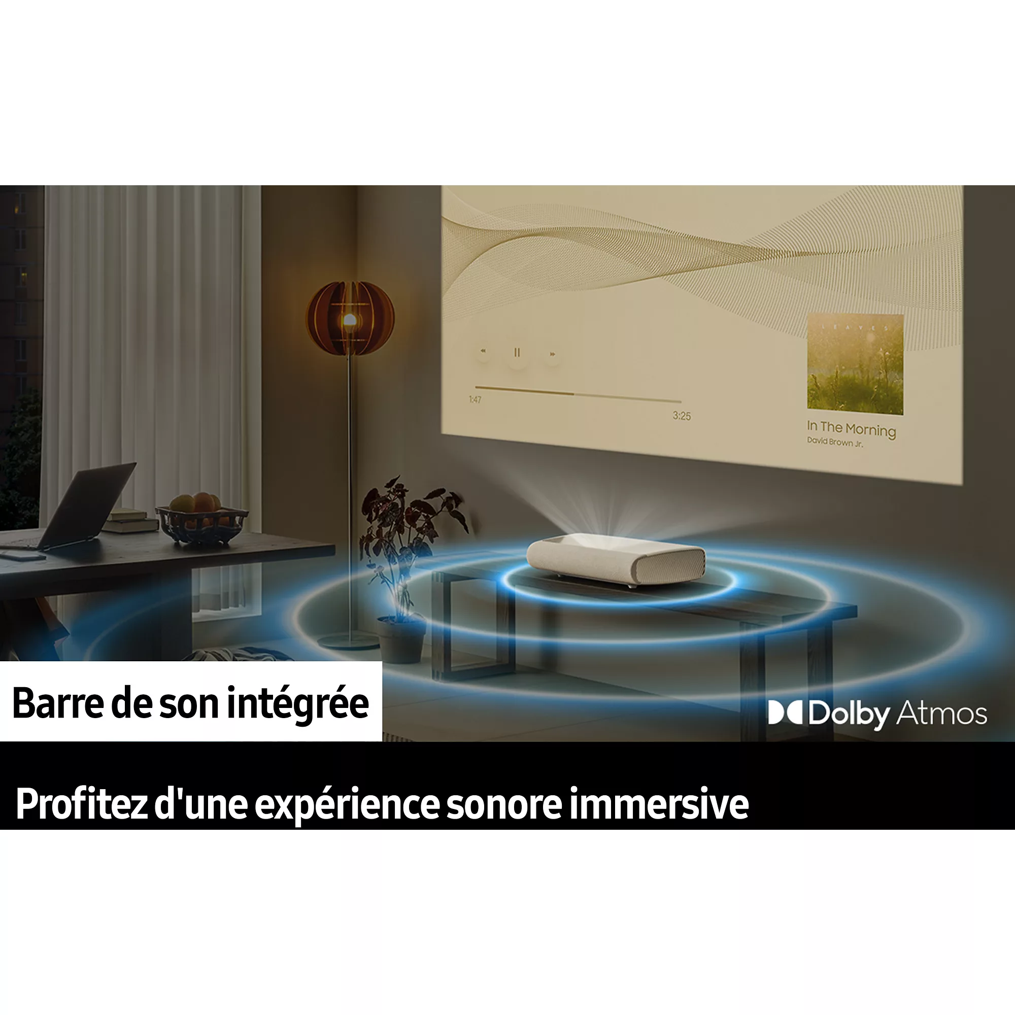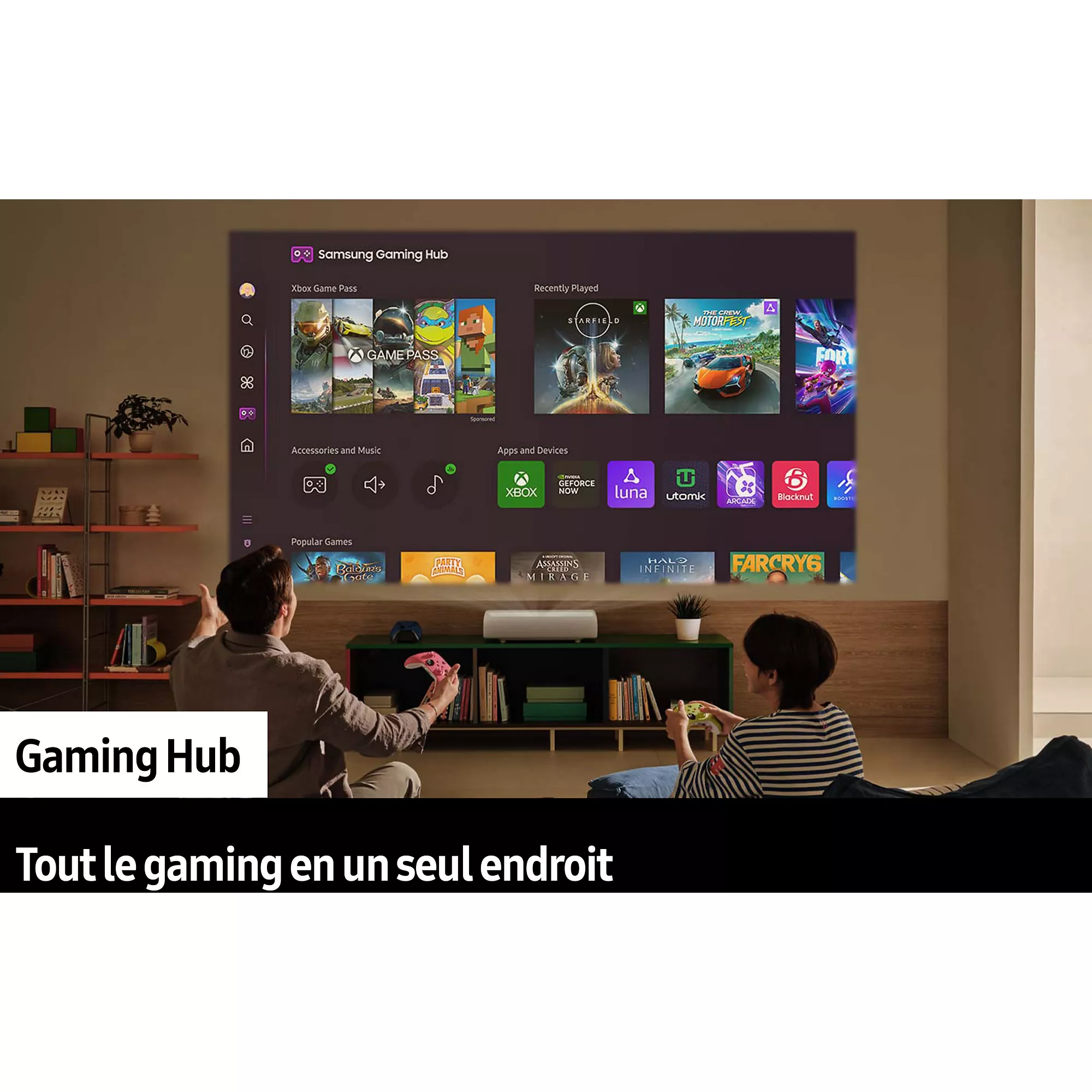 Le système embarque une plateforme Smart TV basée sur Samsung Tizen OS donnant accès aux applications de streaming et contenus multimédias. Le vidéoprojecteur propose également un accès au Gaming Hub pour le cloud gaming sans console. La connectivité permet la duplication d’écran via smartphone et la compatibilité AirPlay 2. Le contrôle des appareils connectés est centralisé via SmartThings. Cette architecture connectée transforme l’appareil en centre multimédia complet.