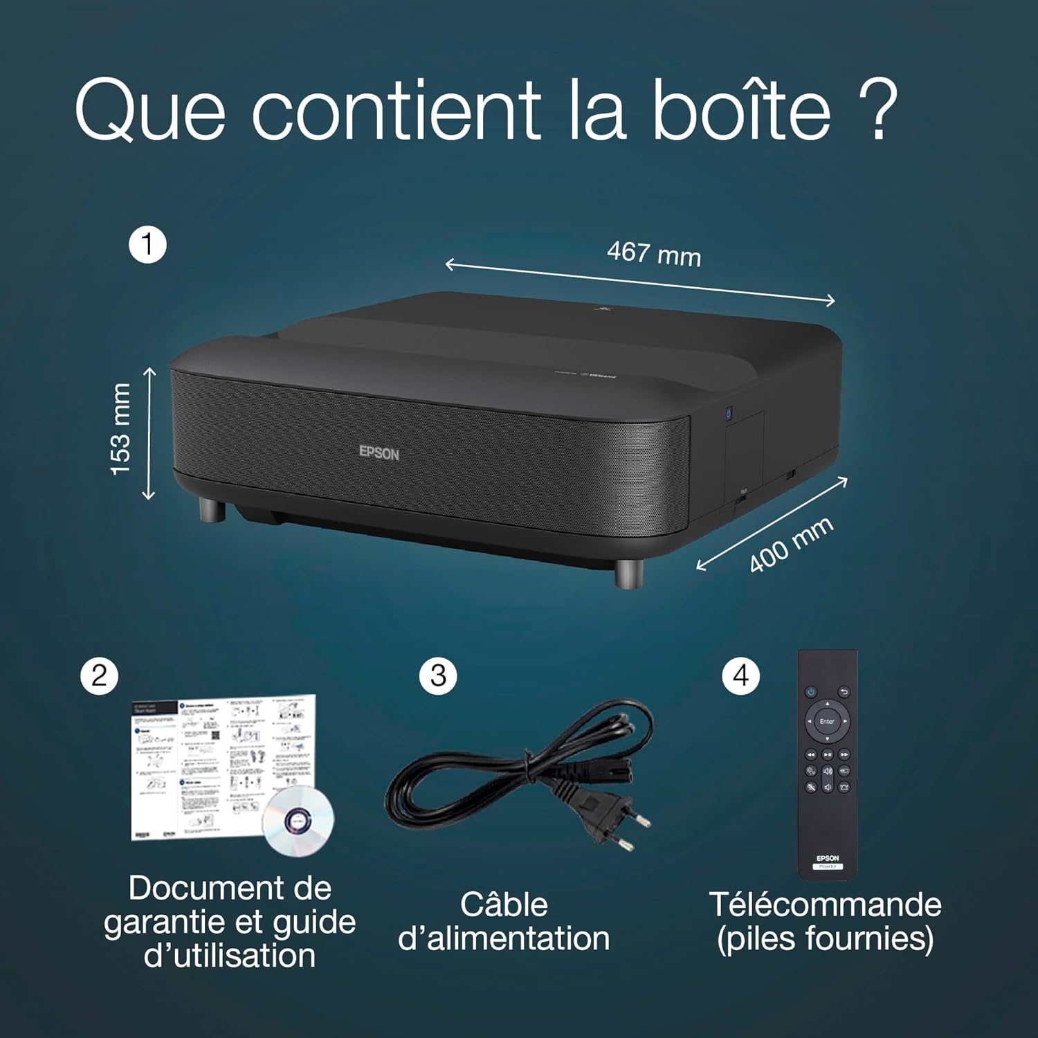 Notre appareil de projection à focale ultra-réduite présente des dimensions pensées pour s’adapter aux meubles TV existants. Avec une largeur de 467 mm, une profondeur de 400 mm et une hauteur de 153 mm, il se pose naturellement sur un meuble bas sans dominer visuellement l’espace. Son poids de 7,4 kilogrammes le rend facilement repositionnable si nécessaire. La consommation électrique de 254 watts en fonctionnement reste raisonnable au regard des performances délivrées, et la veille à 0,5 watt limite la consommation résiduelle à un niveau négligeable. La mise au point manuelle de l’objectif permet un ajustement précis selon la configuration de la pièce et la distance choisie.